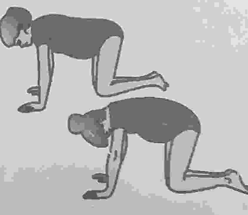 Position yourself on your hands and knees with your head and back paralled to the floor. Tighten your stomach muscles and tuck your buttocks under to round the lower back. Hold for a slow count of 5, then release. Do not hold your breath. Repeat this pelvic tilt 5 times at first. Build up to 10 repetitions.
